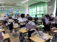 5年生は、総合的な学習の時間「再発見!湯築の素敵!!」というテーマで、道後のこれからについて考える学習を進めて発表をします。その中一つ「伊予の湯」の合唱・合奏の練習を行うときは、密にならないように気を付けながら行っています。まだ練習が始まったばかりで、苦戦する場面も見られますが、本番に向けて5年生みんなの心を一つにして練習に励んでいきます。